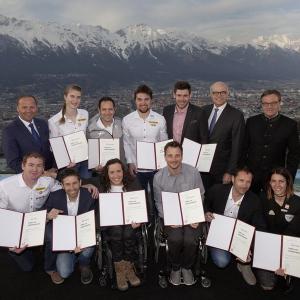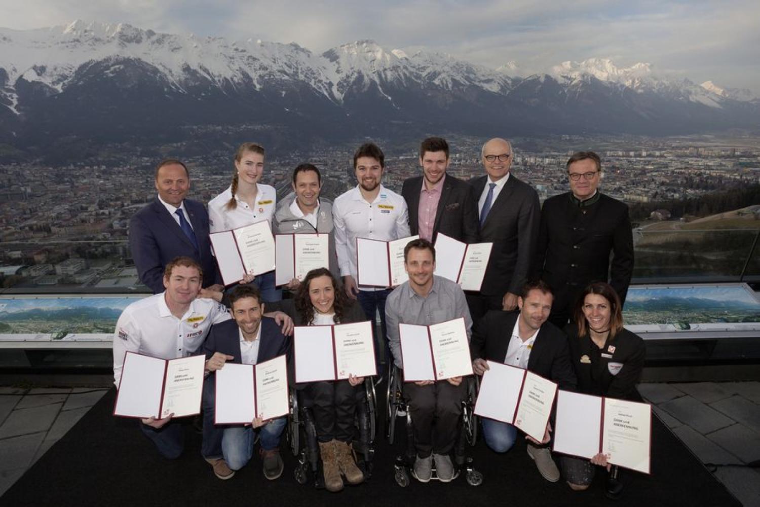 Im Bild oben hintere Reihe v.li.: LHStv Josef Geisler, Madeleine Egle, Reinhold Schett, David Gleirscher, Michael Matt, Karl Stoss (ÖOC Präsident), LH Günther Platter; vordere Reihe v.li.: Peter Penz, Wilhelm Denifl, Claudia Lösch, Simon Wallner, Georg Fischler und Janine Flock. (c) Land Tirol/Die Fotografen