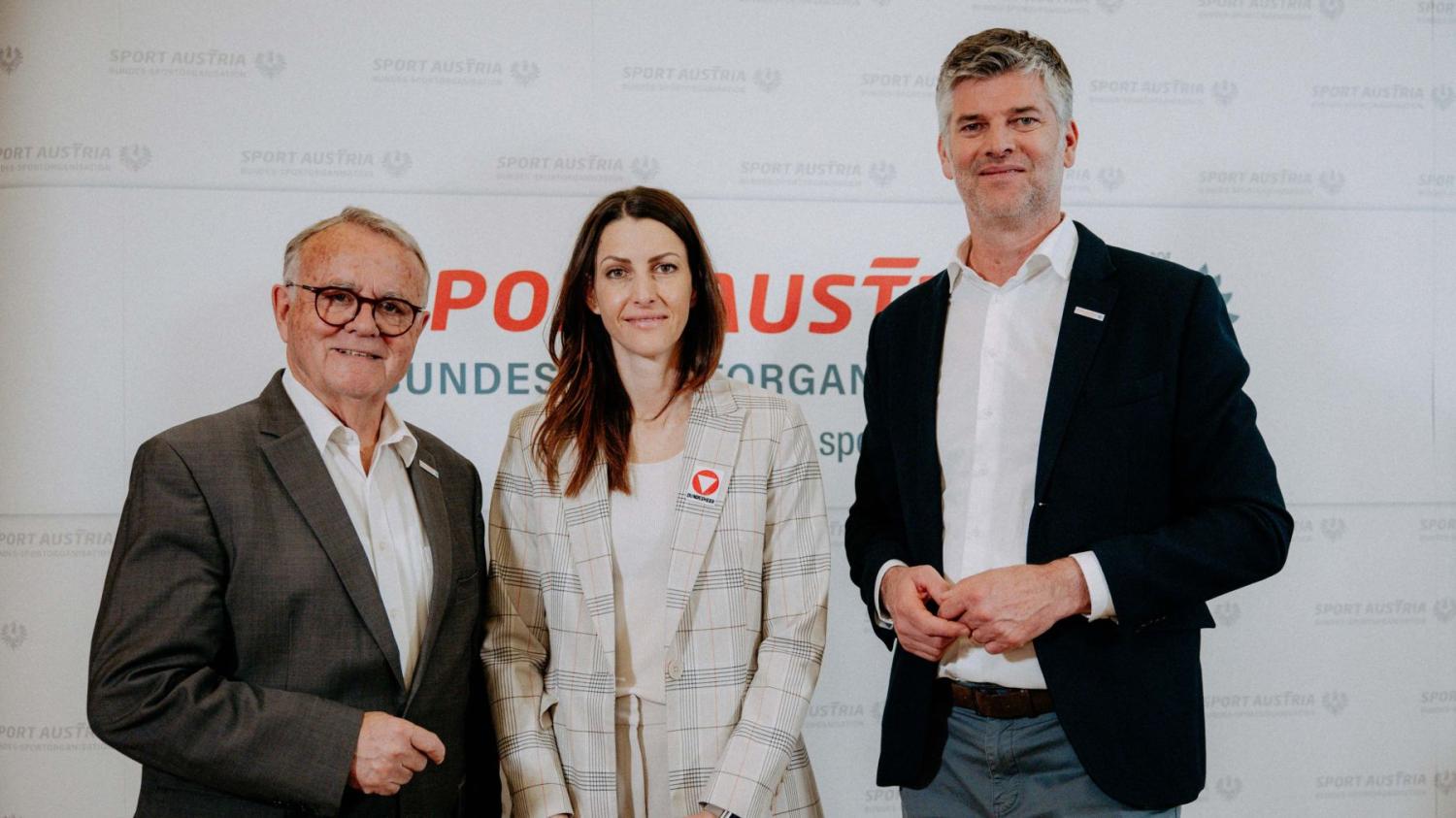 Foto oben (v.l.): Sport Austria-Präsident Hans Niessl, Olympiasiegerin Janine Flock und Sport Austria-Generalsekretär Gerd Bischofter (c) Sport Austria/Michael Meindl