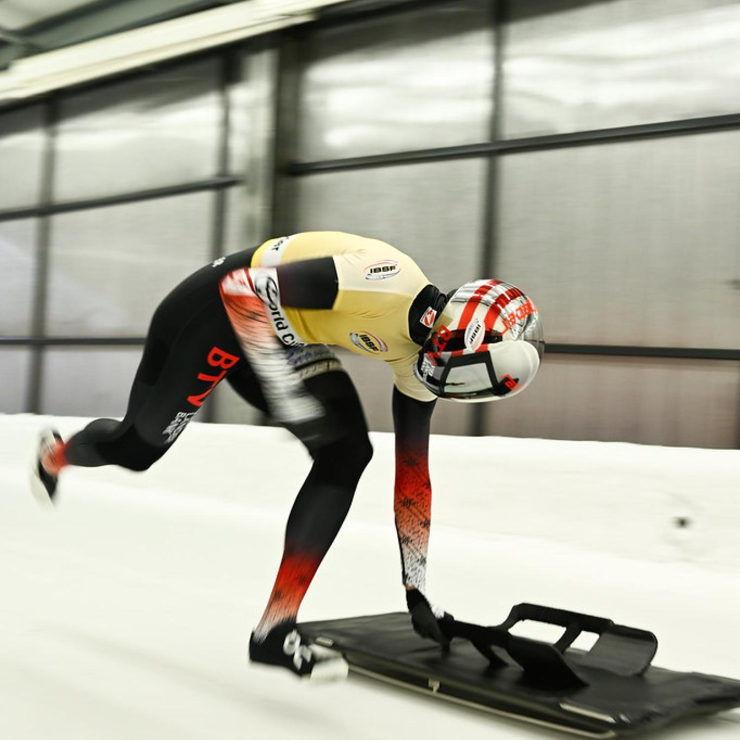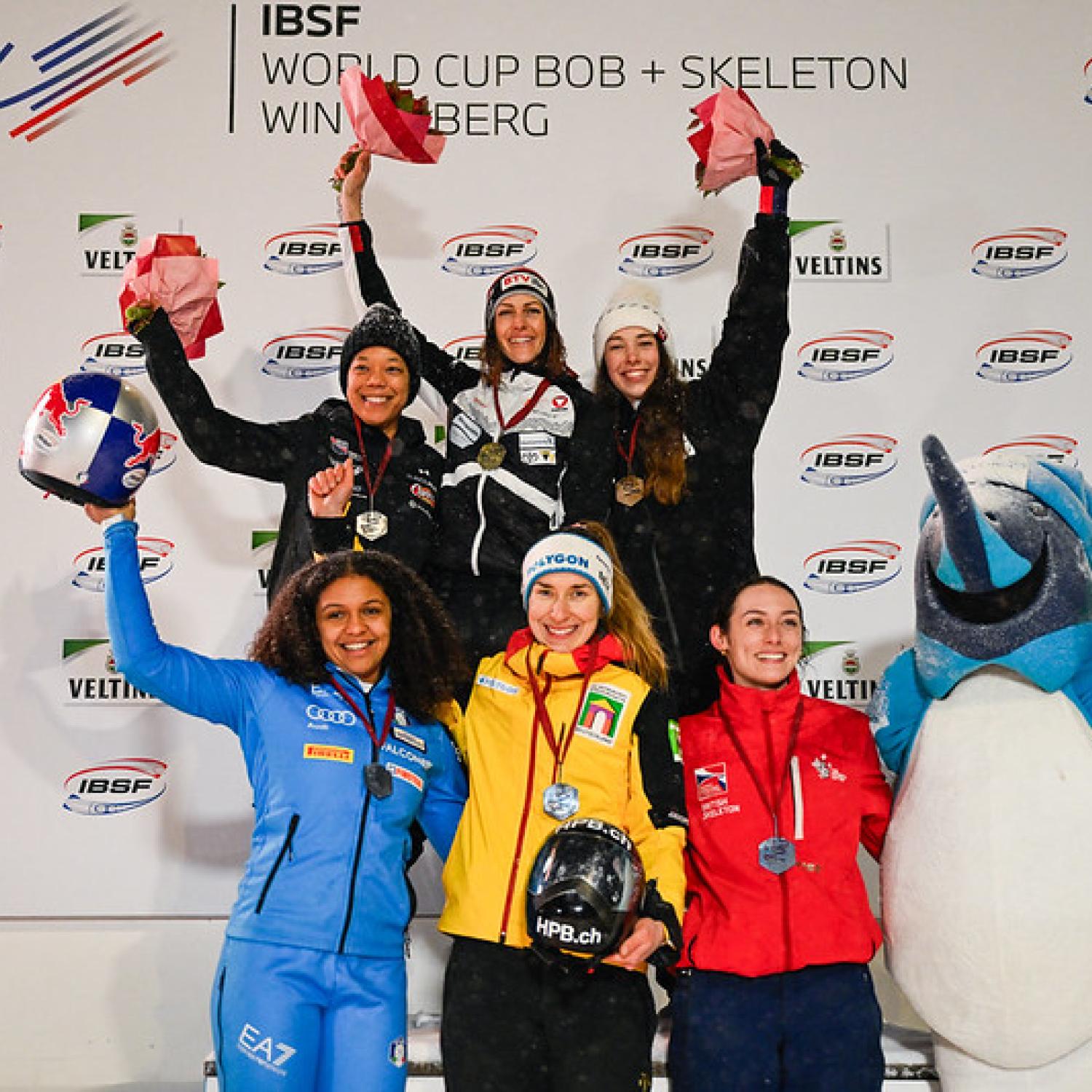 Beim Weltcup-Doppel in Sigulda (das aufgrund der schlechten Präparierung abgesagte Heimrennen von Innsbruck-Igls wurde in Lettland nachgetragen) am 18. und 19. Dezember 2025 holte Janine Flock im Gelben Trikot mit Rang 3 im ersten Rennen ihren 44. Podestplatz, am Tag darauf fehlten 3 Hundertstelsekunden auf die Nummer 45. Fotos (c) IBSF